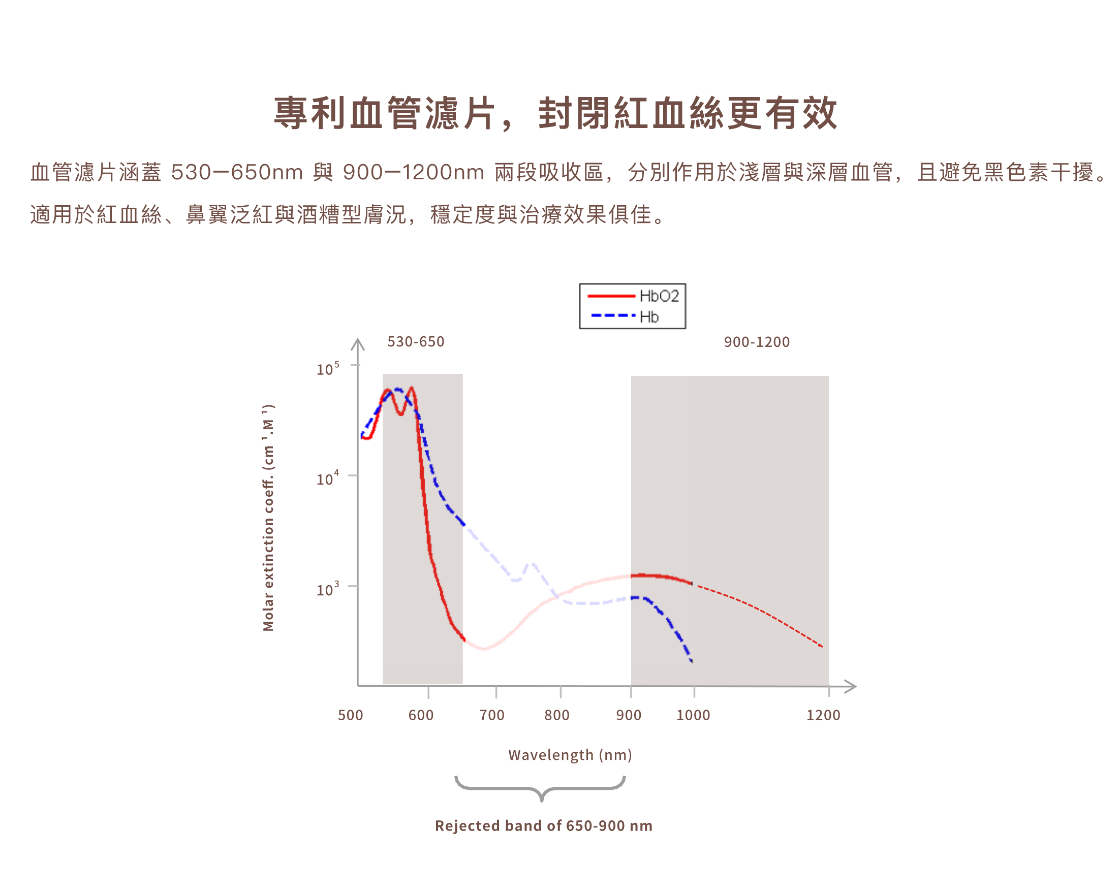 適合血管絲、泛紅與深層紅血絲治療,短波段針對淺層血管擴張,長波段進入深層微血管,達到同步封閉異常血管、減少紅血絲的效果。