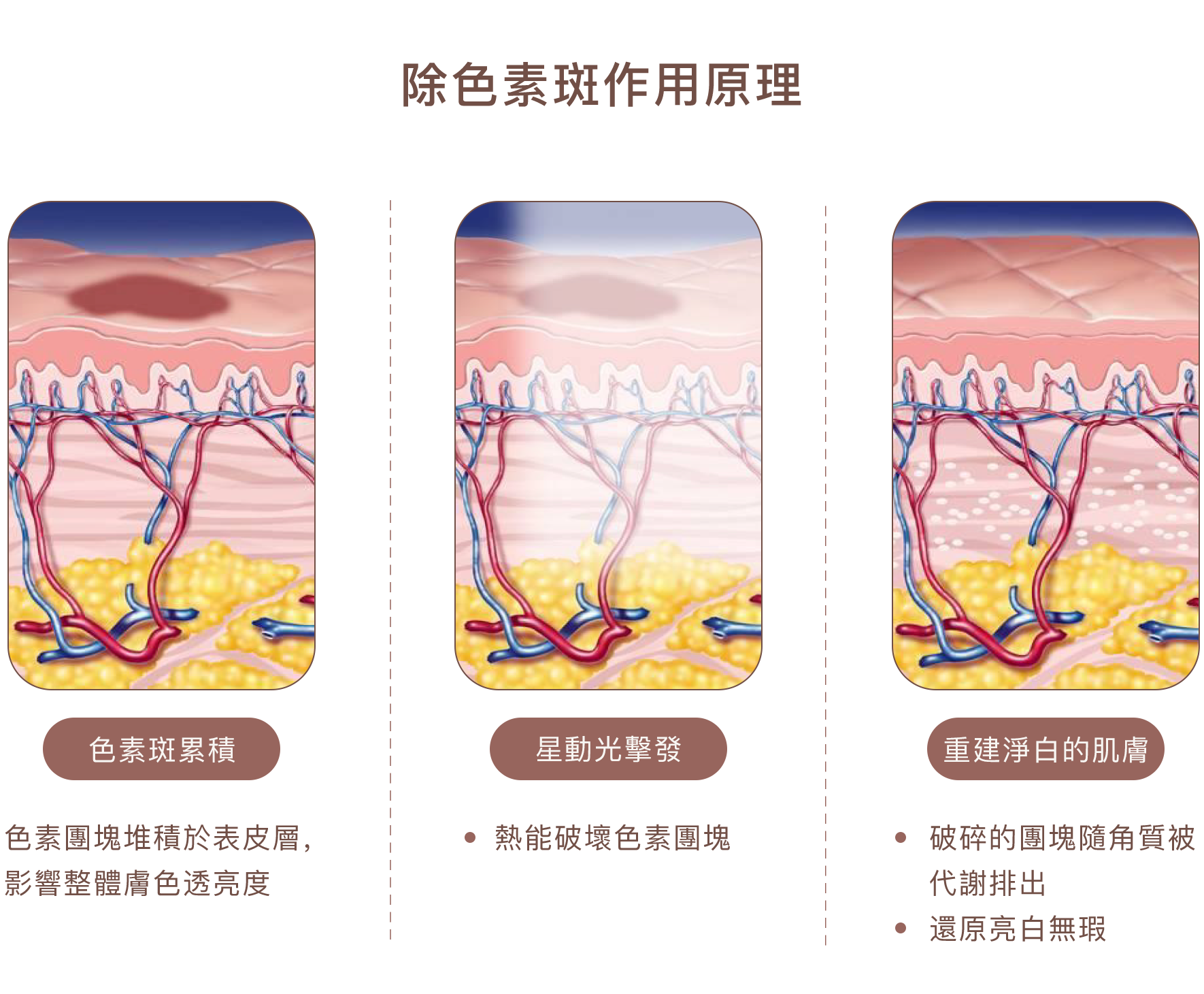 用於中層色素斑點與膚色不均問題,例如曬斑、老人斑與細小黑斑,透過溫和光熱作用,促進表層色素分解代謝。