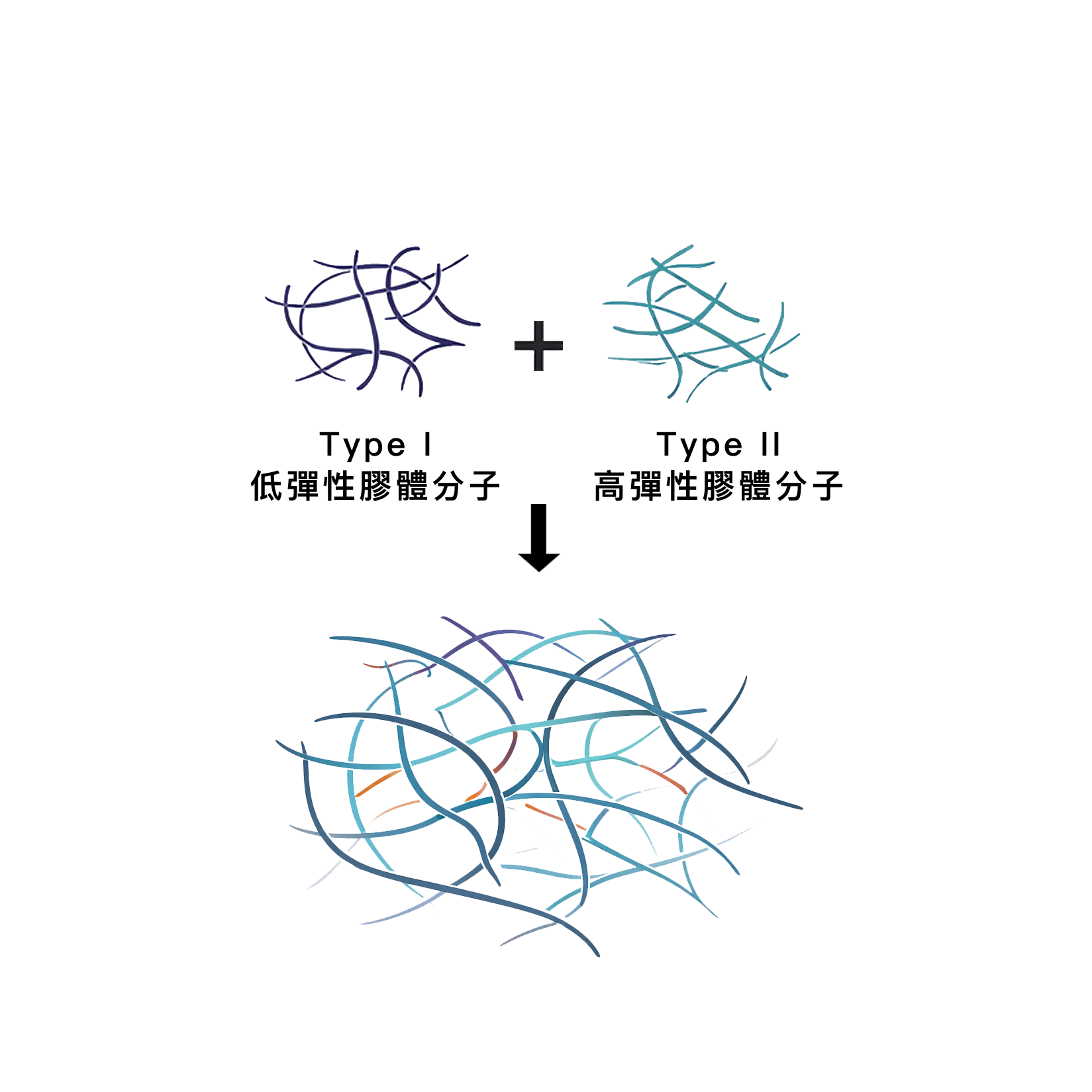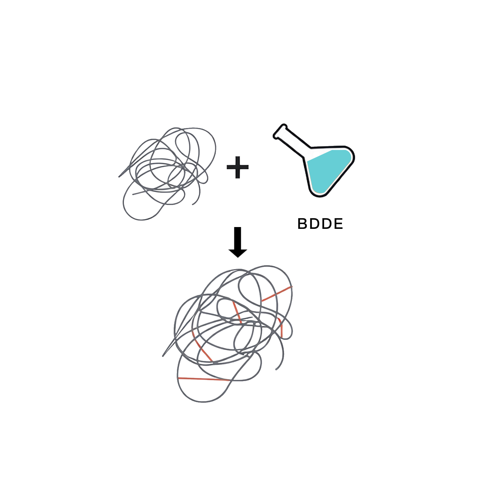 製成 | 以過篩方式挑選不同大小玻尿酸 | 加入BDDE交聯劑與玻尿酸混合 | 將高底彈性玻尿酸透過氫鍵結合 |